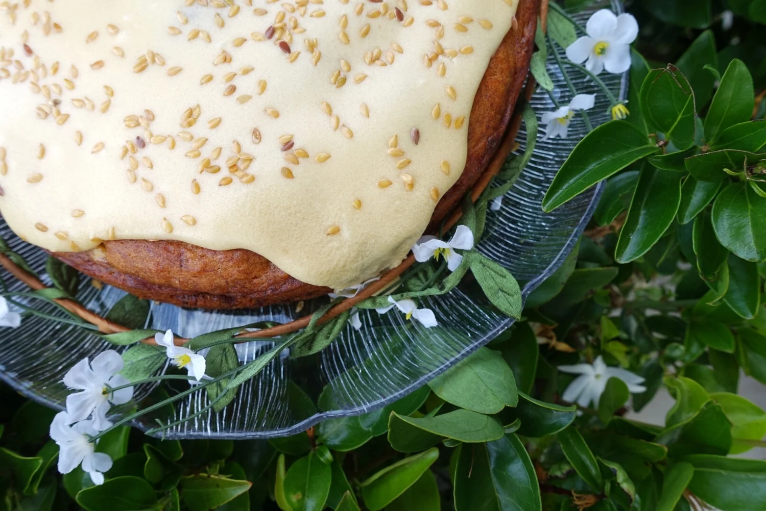 - Prepare the caramel glaze by warming the coconut oil and coconut sugar together over a medium heat in a small saucepan, stirring consistently until a light simmer is reached. Take off the heat and allow to cool and thicken a little, then use a fork to incorporate and slightly whip in the icing sugar. Pour onto the centre of the cake, spread out until the icing is around a centimetre or two from the edge (to allow for running), and sprinkle with as many golden linseeds as you see fit.