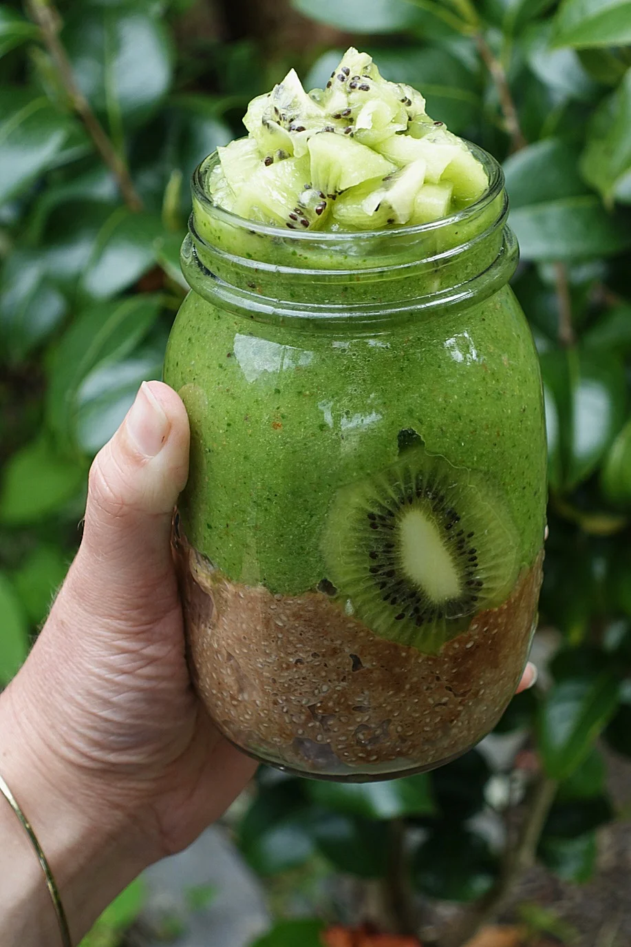 - Take your chia seed pudding and stir in the cacao powder, then scoop into a glass or jar. Take a slice of kiwifruit and press it against the side of the glass, then pour the green smoothie on top. Adorn with crushed kiwifruit, and serve immediately!