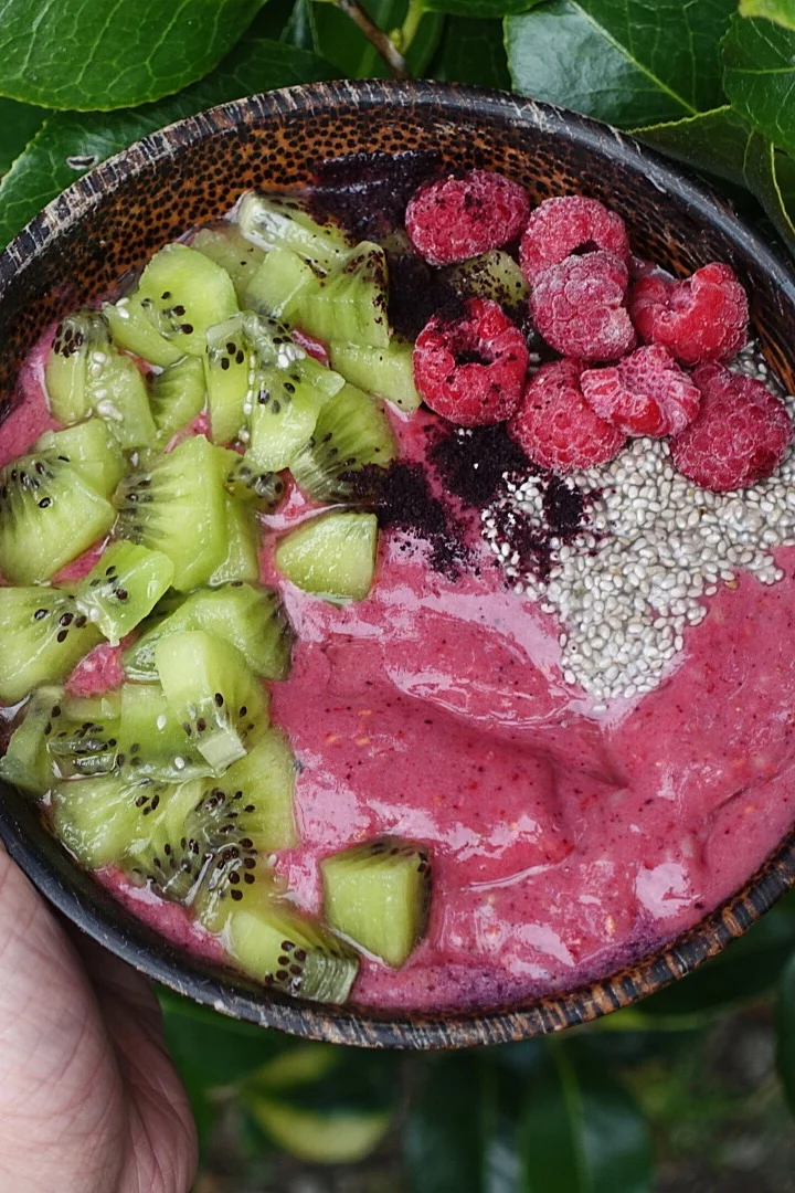 - Top the smoothie bowl with the kiwifruit, raspberries, and the soaked chia pudding. Sprinkle with acai powder and serve immediately!