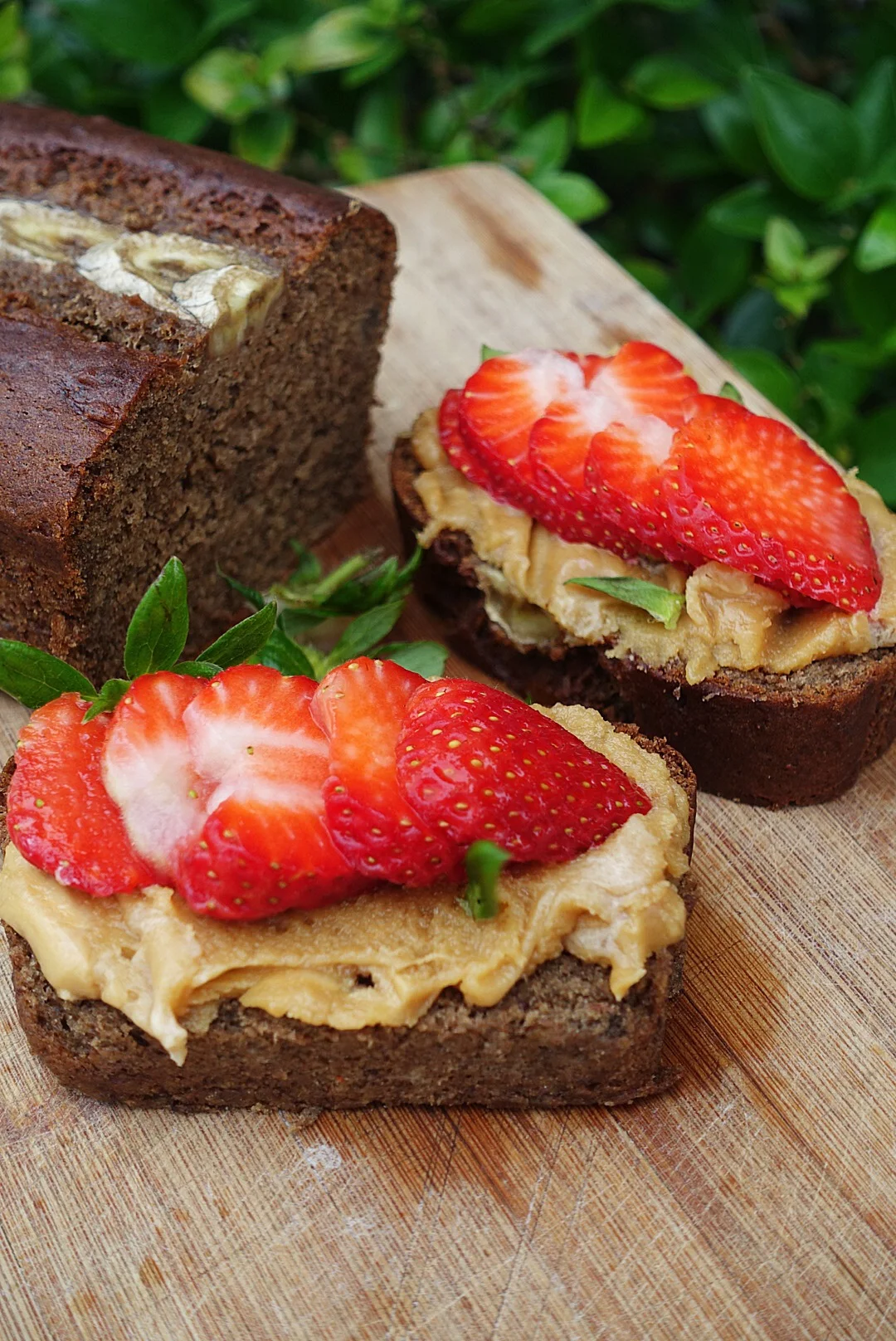 - Once cooled in its tin for around 30 minutes, tip out onto a serving platter or board, slice into thick wedges, and top with the maple peanut butter and sliced strawberries. Enjoy!