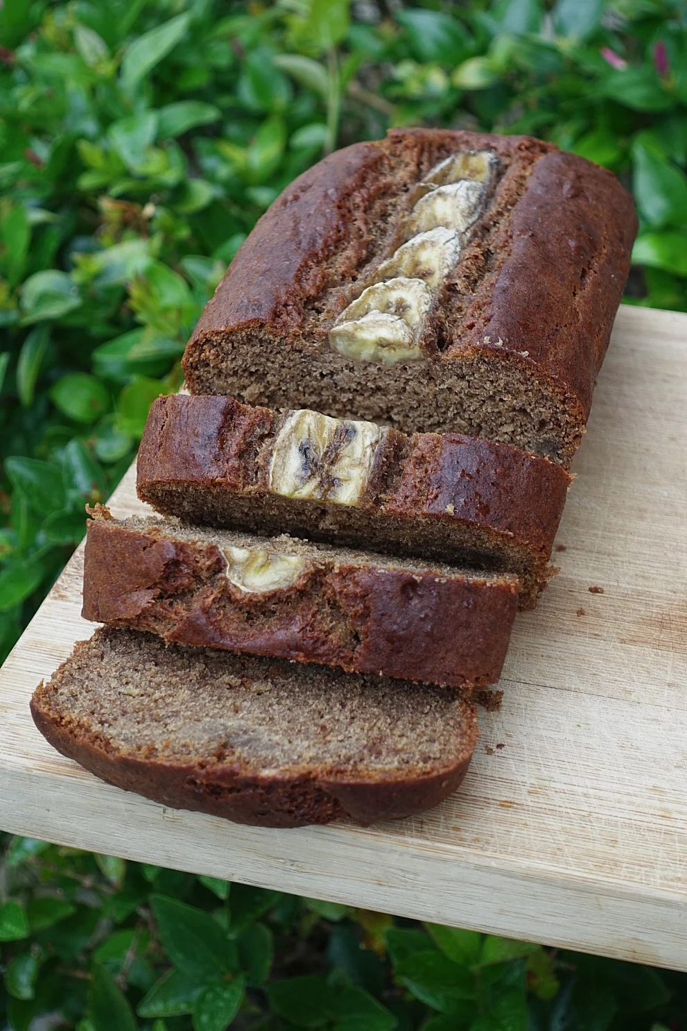 - Peel the ripe banana, then carefully slice diagonally. Fan the slices out lengthways and lay atop the banana bread batter.