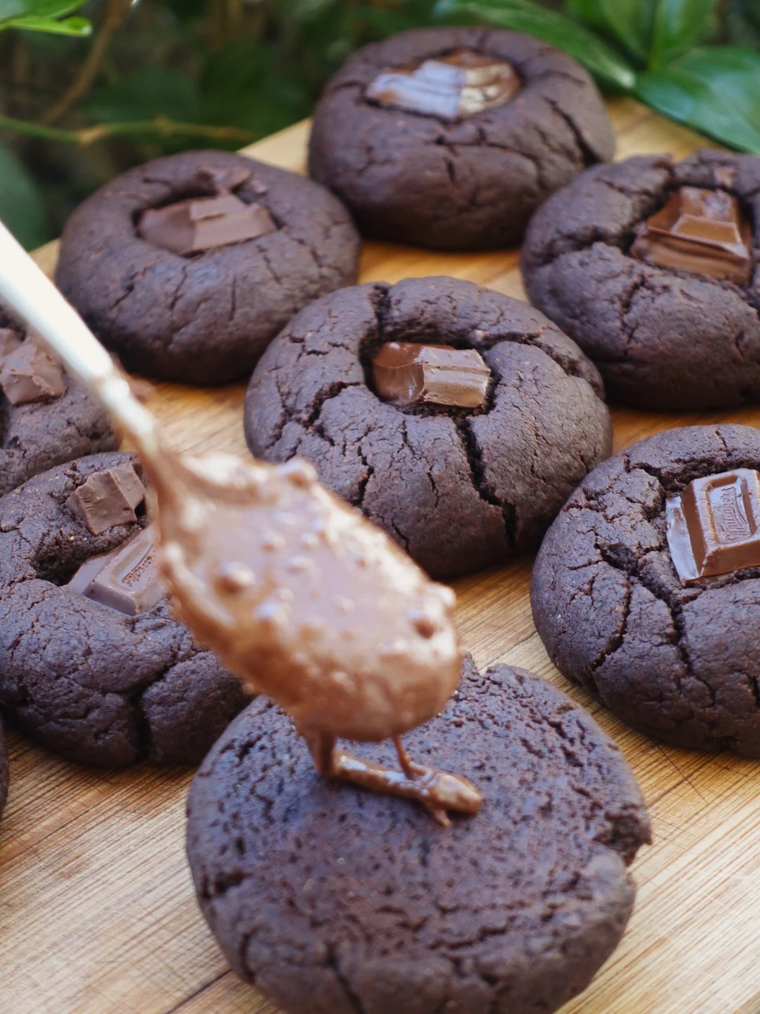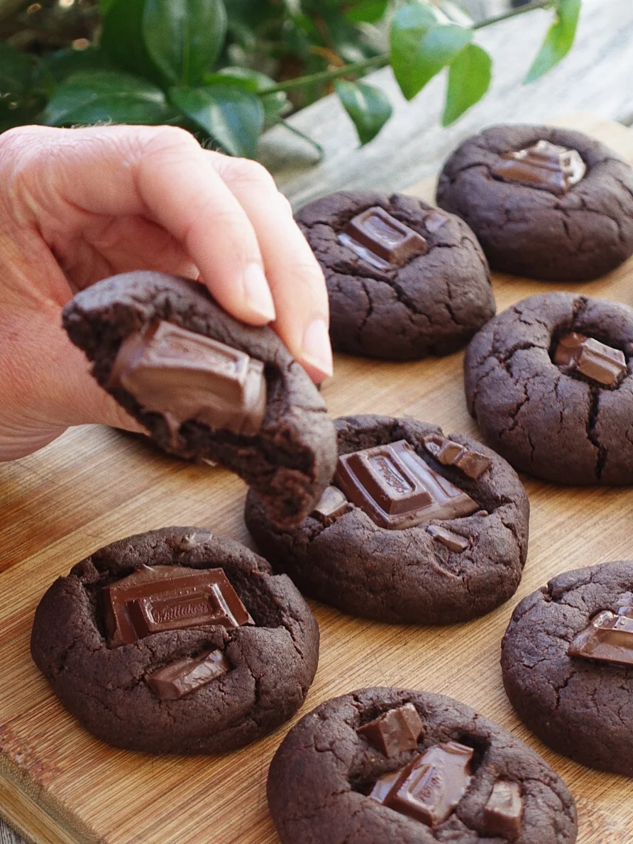 - Take your dark chocolate and break it into large chunks, then press them into the cookies.