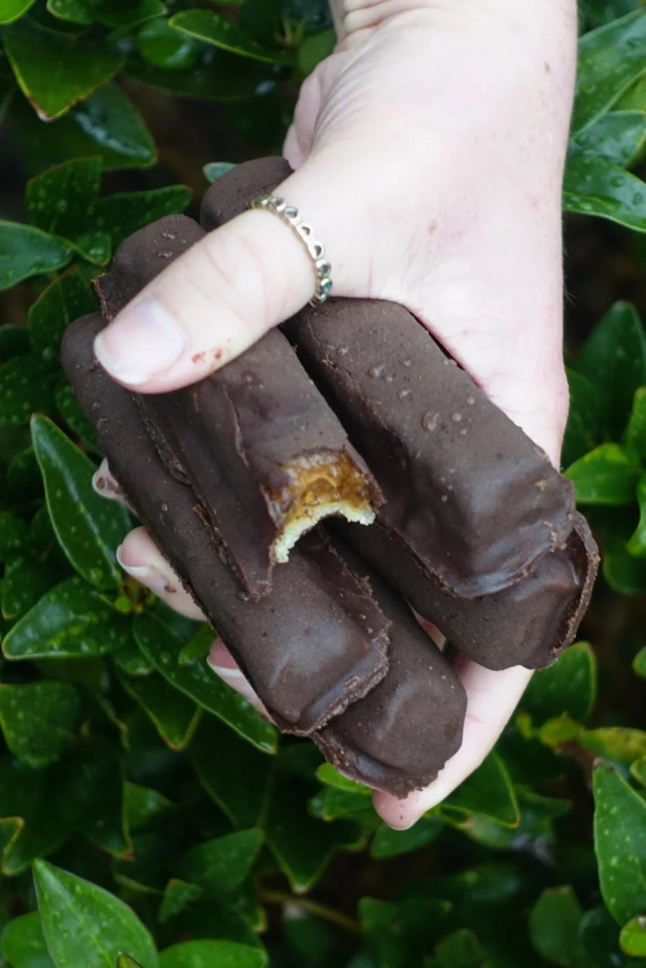 Unfortunately, 'Twix' doesn't quite have the same ring to it, but I do still get cravings for the crispy chocolate-covered caramel bar every now and then thanks to strategically placed candy stands and the nibbling schoolgirls I stroll past on my way home from university (that's right, I've officially been promoted from squirming foetus to adult-ish blob). That's exactly why I invented these visually identical (and admittedly gustatorily dissimilar, but equally as delicious) vegan versions of my old favourite!