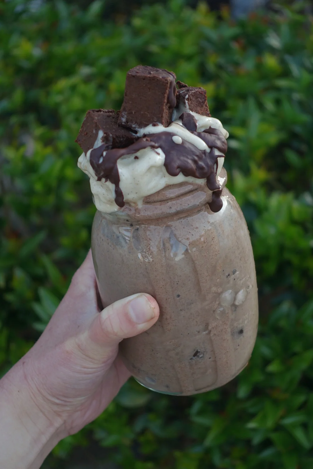 - Now, give your food processor a quick rinse and throw in the frozen banana chunks, vanilla bean powder, and maple syrup for the vanilla bean icecream. Blend until fluffy and silky smooth, scraping the sides down when necessary, then scoop on top of the chocolate thickshake. Drizzle over the melted chocolate, squish them brownie chunks in, and perhaps even scatter a few walnut pieces over if you've got them on hand. Serve immediately, and with lots of napkins!