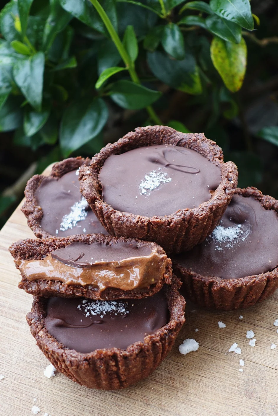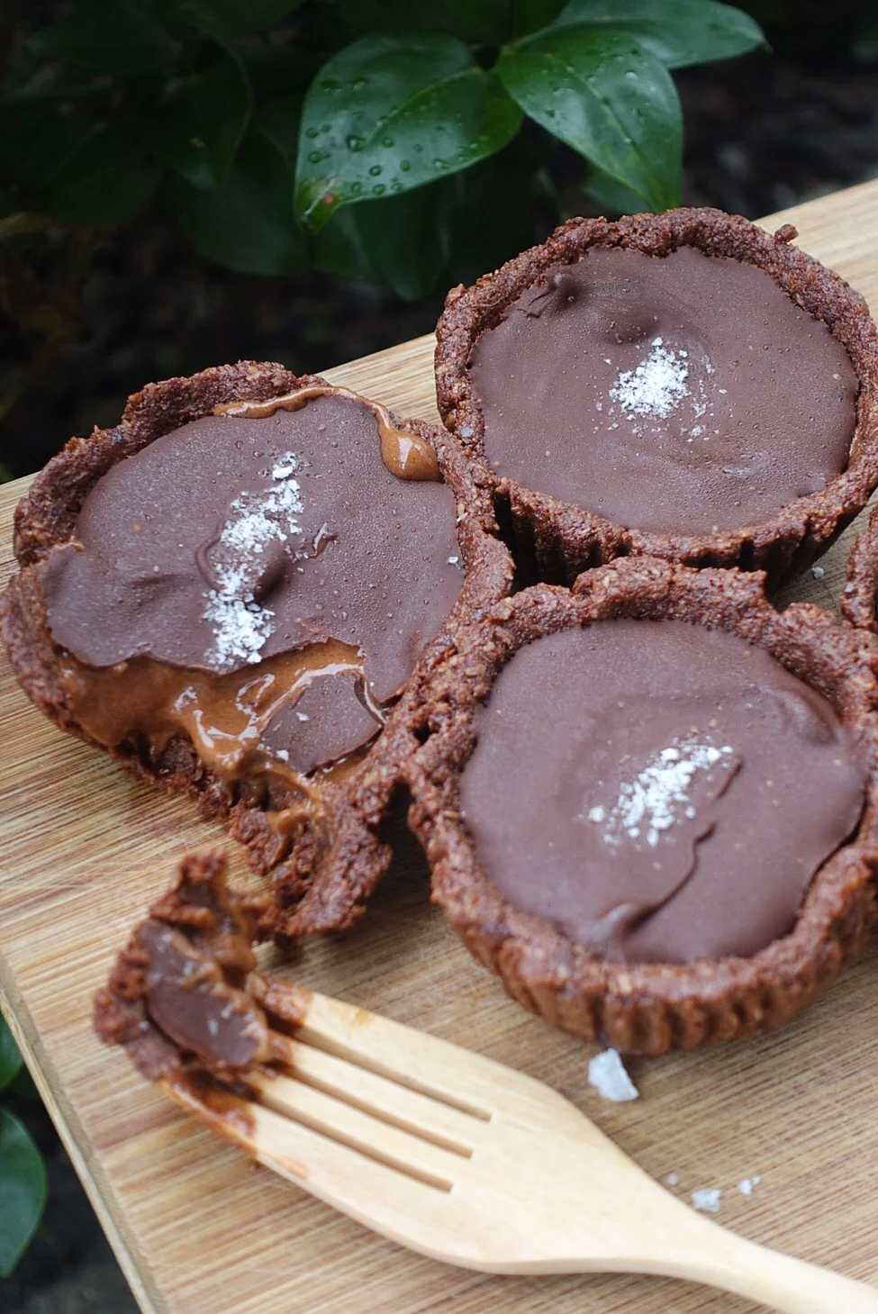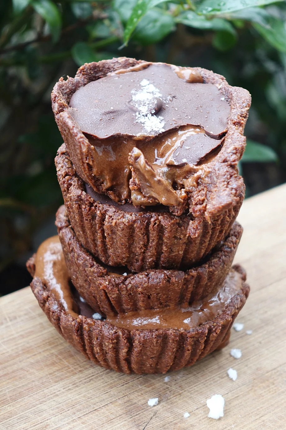 Sticky, sweet, and salty is a combination that rarely fails, and these lovely little tarts are no exception. Inside a raw chocolate casing, and beneath a layer of crackling chocolate, hides a nest of oozing salted caramel and rich chocolate mousse; my single-serve whole foods variation of a classic chocolate caramel tart. I conjured these up with those who cannot tolerate nuts in mind - instead, you will find an assortment of coconut, alongside a mixture of dates and copious amounts of cacao. These are also much more wholesome than a lot of raw desserts, opting for whole fruits as opposed to syrups for sweetness.