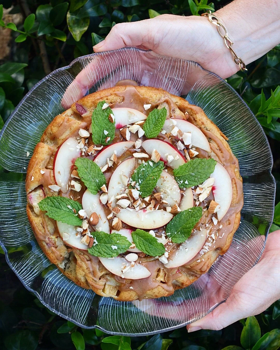 - When almost cool, make your maple cinnamon glaze by stirring together the icing sugar, maple syrup, cinnamon, and vanilla. Drizzle atop the cake, then adorn with your fresh nectarine slices, fresh mint leaves, crushed almonds, and maple syrup.