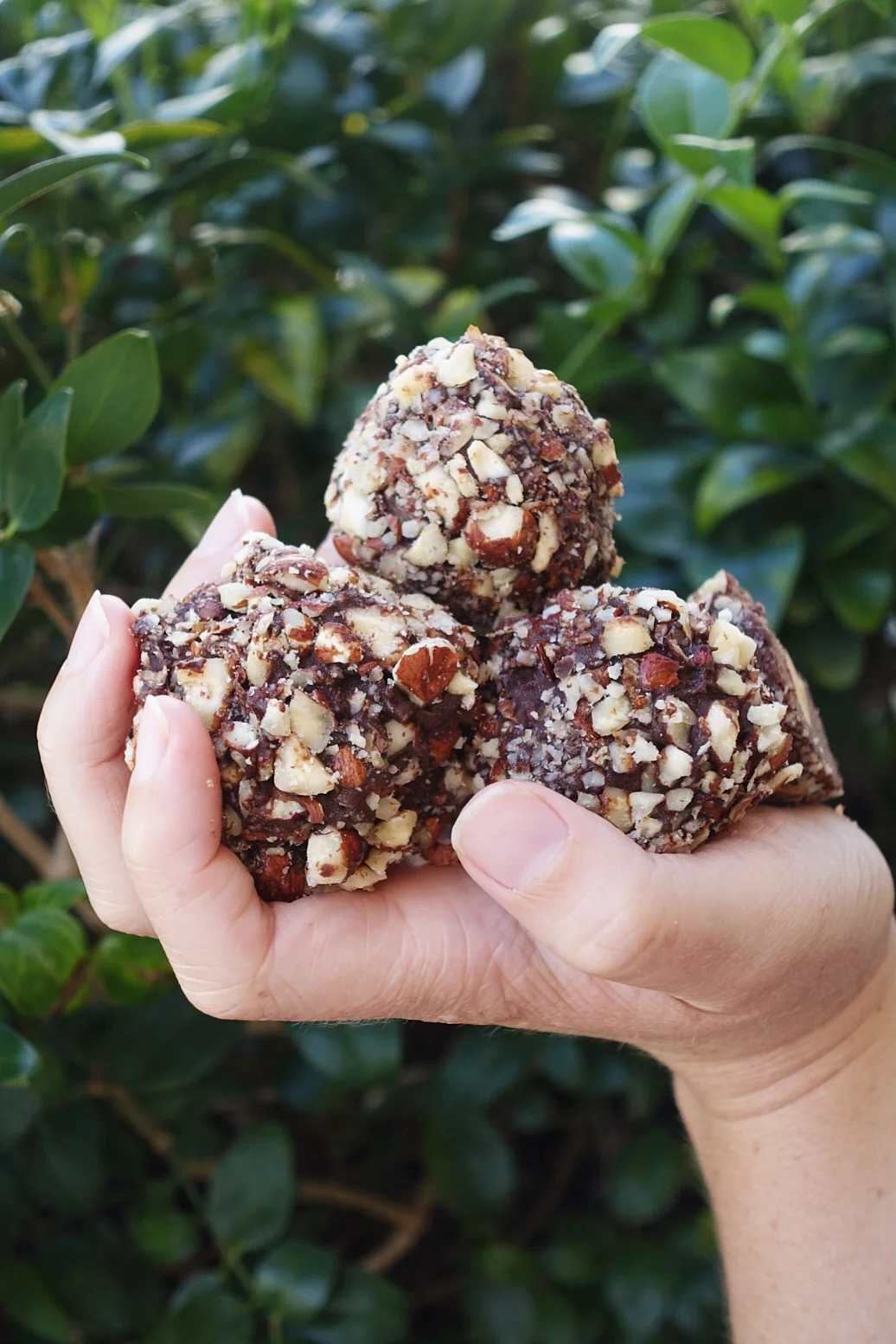 - Take your balls out of the freezer, then dunk each one in the melted chocolate. While still gooey, transfer to the bowl of crushed hazelnuts and shake to completely cover. Carefully remove and set on the plate, and repeat until all of your balls have been coated.